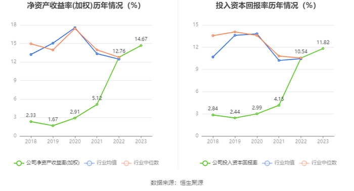 数据显示,2023年公司加权平均净资产收益率为14.67%,较上年同期增长1.91个百分点;公司2023年投入资本回报率为11.82%,较上年同期增长1.28个百分点。