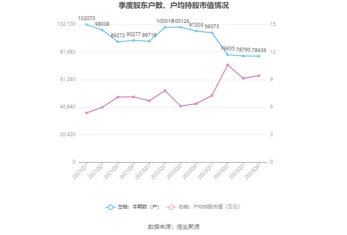 筹码集中度方面,截至2023年年末,公司股东总户数为7.86万户,较三季度末下降了154户,降幅0.20%;户均持股市值由三季度末的9.14万元上升至9.43万元,增幅为3.17%。