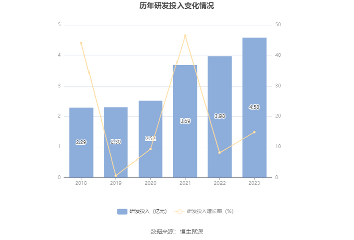 2023年全年,公司研发投入金额为4.58亿元,同比增长14.90%;研发投入占营业收入比例为4.34%,相比上年同期上升0.36个百分点。此外,公司全年研发投入资本化率为0。