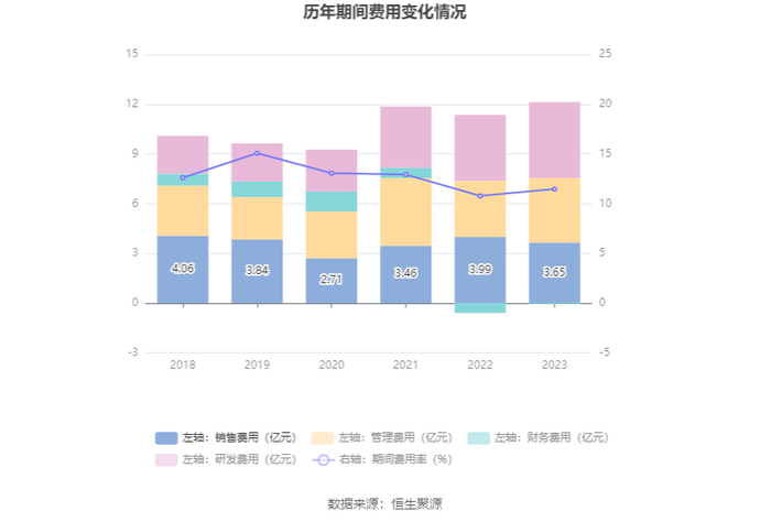 2023年,公司期间费用为12.08亿元,较上年同期增加1.31亿元;期间费用率为11.46%,较上年同期上升0.68个百分点。其中,销售费用同比下降8.43%,管理费用同比增长14.96%,研发费用同比增长14.9%,财务费用由去年同期的-5898.37万元变为-480.35万元。
