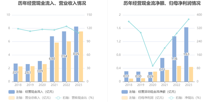 2023年,公司营业收入现金比为109.62%,净现比为374.37%。