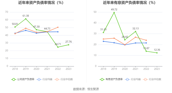 在偿债能力方面,公司2023年年末资产负债率为27.76%,相比上年末上升3.05个百分点;有息资产负债率为12.36%,相比上年末下降1.51个百分点。
