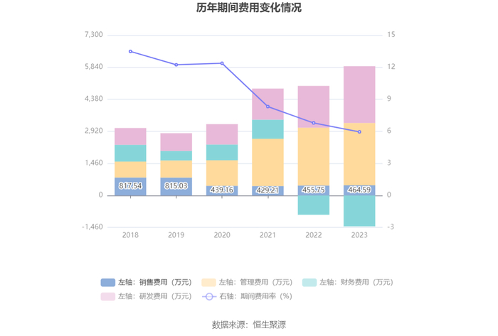 2023年,公司期间费用为4480.97万元,较上年同期增加372.51万元;但期间费用率为5.95%,较上年同期下降0.84个百分点。其中,销售费用同比增长1.94%,管理费用同比增长7.74%,研发费用同比增长36.07%,财务费用由去年同期的-881.24万元变为-1407.46万元。