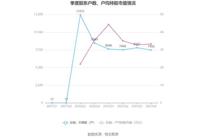 筹码集中度方面,截至2023年年末,公司股东总户数为7902户,较三季度末下降了345户,降幅4.18%;户均持股市值由三季度末的32.74万元上升至33.39万元,增幅为1.99%。