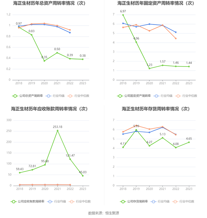 营运能力方面,2023年,公司公司总资产周转率为0.38次,上年同期为0.39次(2022年行业平均值为0.87次,公司位居同行业20/21);固定资产周转率为1.44次,上年同期为1.46次(2022年行业平均值为5.12次,公司位居同行业21/21);公司应收账款周转率、存货周转率分别为45.03次、4.65次。