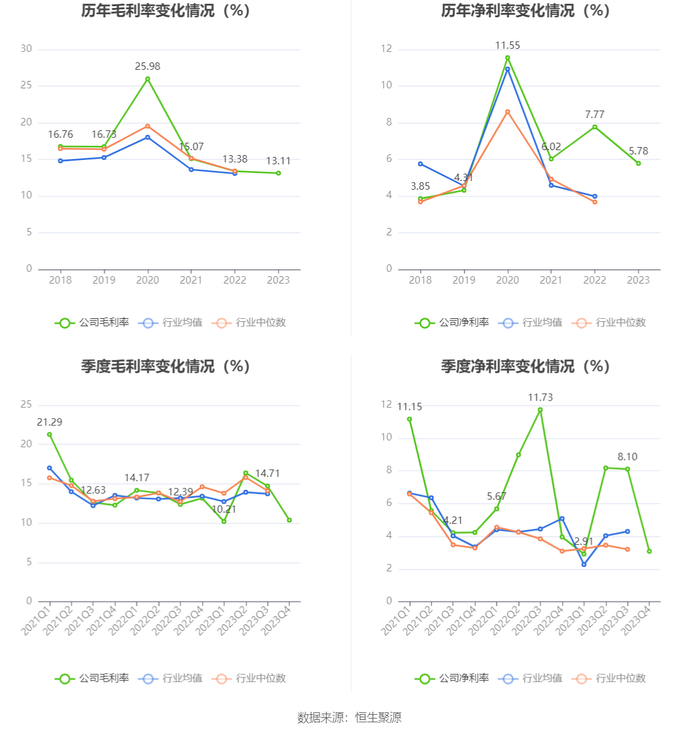 2023年,公司毛利率为13.11%,同比下降0.27个百分点;净利率为5.78%,较上年同期下降1.99个百分点。从单季度指标来看,2023年第四季度公司毛利率为10.38%,同比下降2.79个百分点,环比下降4.33个百分点;净利率为3.08%,较上年同期下降0.87个百分点,较上一季度下降5.02个百分点。