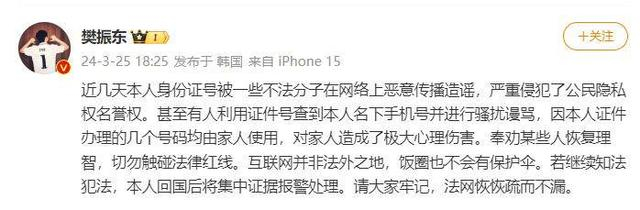 3月25日,国乒选手樊振东在微博发文称:“近几天本人身份证号被一些不法分子在网络上恶意传播造谣,严重侵犯了公民隐私权名誉权。甚至有人利用证件号查到本人名下手机号并进行骚扰谩骂,因本人证件办理的几个号码均由家人使用,对家人造成了极大心理伤害。”