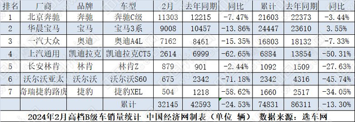 相较于细分市场大盘单月微降、累计攀高的趋势,合资B级轿车市场可谓“春寒料峭”。20款车型2月合计销量83493辆,同比下降36.74%,其中只有帕萨特、迈腾和奔驰C级3款车型月销破万;1-2月累计来看,共销售新车221253辆,相较去年同期下降超10%。