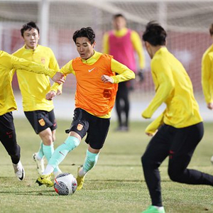 3月24日晚,国足在天津奥体中心外场备战26日晚与新加坡队主场世预赛36强赛,韦世豪(中)身穿“首发背心”。视觉中国供图