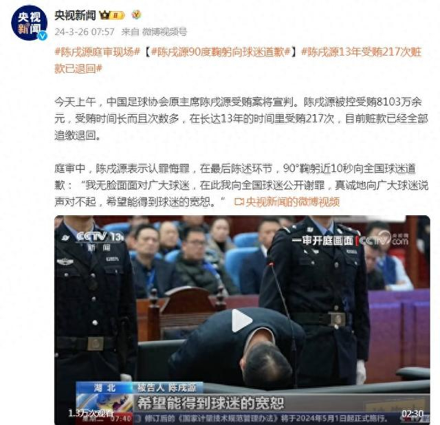 陈戌源庭审现场:90度鞠躬向球迷道歉
