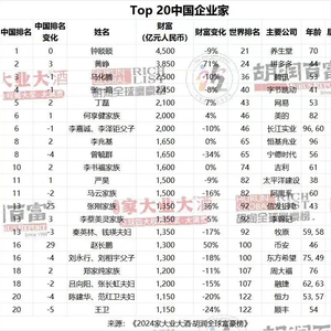 房地产企业家的财富则有所缩水,万达的王健林家族财富缩水72%至300亿元,旗下万达商管大部分股份已被冻结;碧桂园的杨惠妍家族财富缩水60%至440亿元。