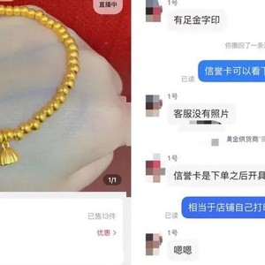 其中一位投诉者王晓灵(化名)称,某在短视频平台刷到一个主播拿着一个40多克的古法手镯表示“金店开业回馈粉丝送300万真黄金”。“拿出来一个黄金吊坠,说999真黄金,支持线下检验,并且承诺假一赔十万。”王晓灵对主播这句话信以为真,总共花500多元买了三件金饰。但是收到货后,她发现镯子颜色明显异常。两个月过去,王晓灵没有得到售后妥善处理。