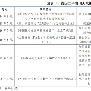 2019年9月,央行印发《金融科技发展规划(2019-2021年)》,要求合理布局云计算,引导金融机构探索云计算解决方案,搭建安全可控的金融行业云服务平台,构建集中式与分布式协调发展的信息基础设施架构,强化云计算安全技术研究与应用。