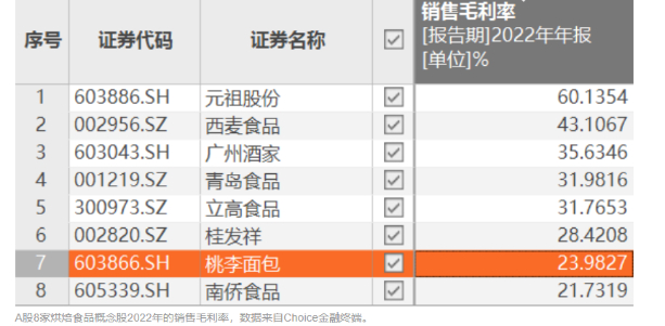 据东财Choice金融终端数据显示,2022年,A股共有8家烘焙食品概念股,桃李面包毛利率排在第7位,仅高于南侨食品。