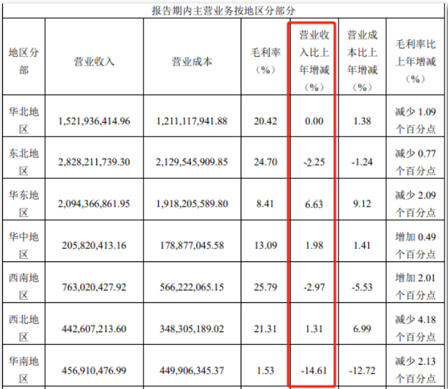其中,东北地区营收为28.28亿元,华东地区为20.94亿元、华北和西南地区为15.22亿、7.63亿元,其他地区均不超5亿,与大本营东北地区营收对比悬殊。