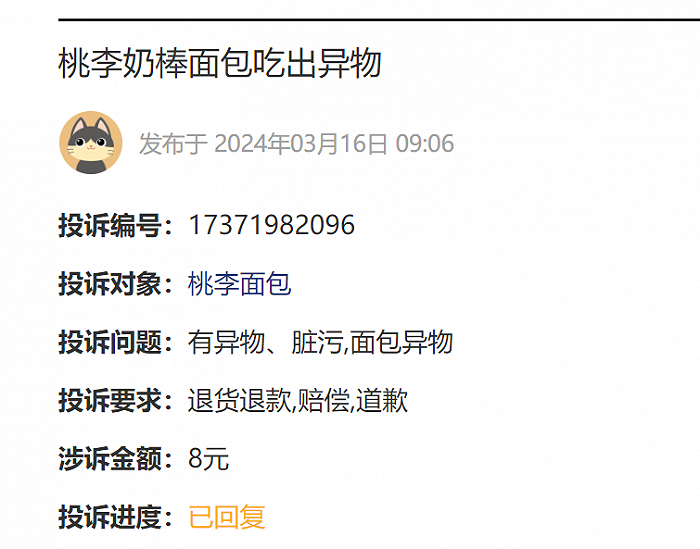 如2024年3月16日,投诉编号17371982096显示,一用户称桃李奶棒面包吃出异物,要求赔偿并道歉。