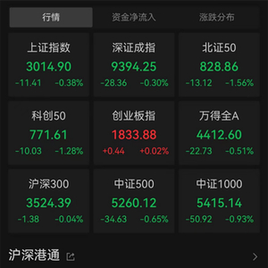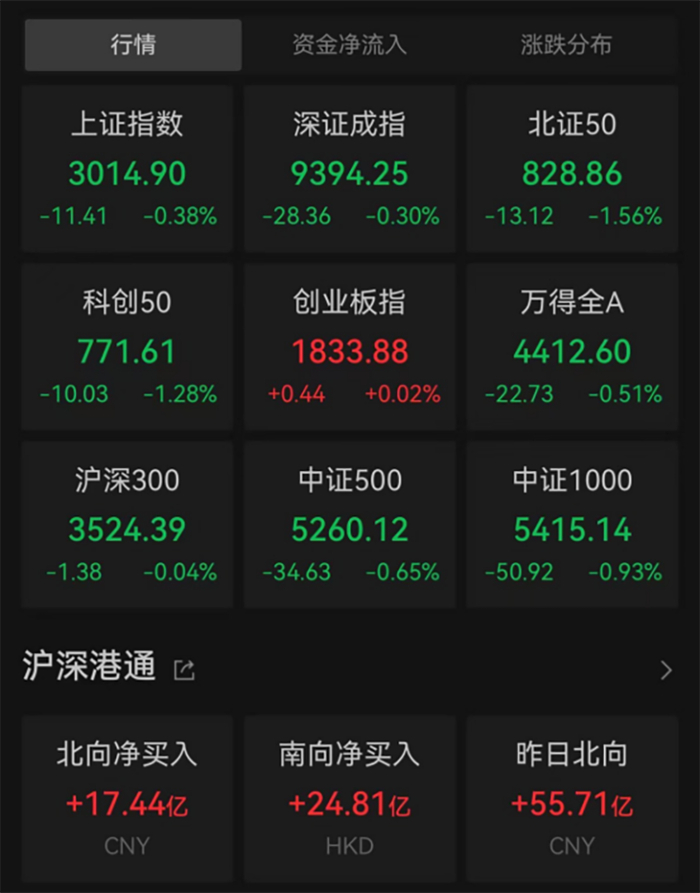 周二早盘,A股三大指数冲高回落,创业板指较为坚挺。截至午间收盘,上证指数跌0.38%,深证成指跌0.30%,创业板指涨0.02%。沪深两市半日成交额5732亿元,较上个交易日同期缩量574亿元。北向资金半日净买入17.44亿元。