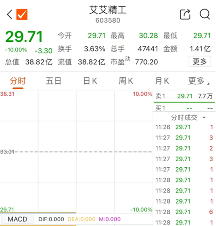 个股方面,15天14板的“妖股”艾艾精工早盘跌停。截至午间收盘,艾艾精工报29.71元/股,成交额1.41亿元,最新总市值38.82亿元。