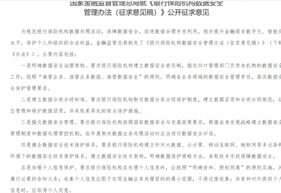 日前,金融监管总局官网显示,金融监管总局制定了《银行保险机构数据安全管理办法(征求意见稿)》。