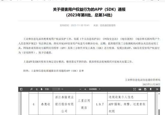 浙江泰隆商业银行泰惠收App因违规收集个人信息以及App强制、频繁、过度索取权限被工信部通报。