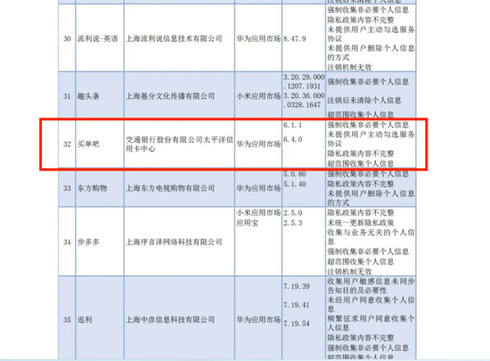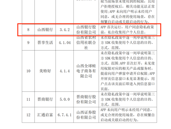 此前,交通银行、浙江泰隆商业银行、重庆银行、吉林银行、山西银行、晋商银行等多家银行App均被“点名”。