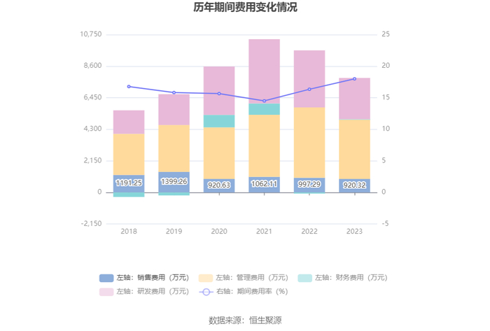 2023年,公司期间费用为7795.68万元,较上年同期减少1802.28万元;但期间费用率为17.99%,较上年同期上升1.65个百分点。其中,销售费用同比下降7.72%,管理费用同比下降15.82%,研发费用同比下降27.73%,财务费用由去年同期的-77.46万元变为32.89万元。