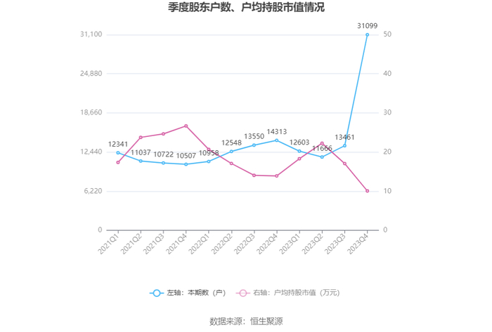 筹码集中度方面,截至2023年年末,公司股东总户数为3.11万户,较三季度末增长了1.76万户,增幅131.03%;户均持股市值由三季度末的17.08万元下降至10.09万元,降幅为40.93%。