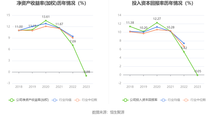 数据显示,2023年公司加权平均净资产收益率为-0.98%,较上年同期下降8.07个百分点;公司2023年投入资本回报率为-0.05%,较上年同期下降5.47个百分点。