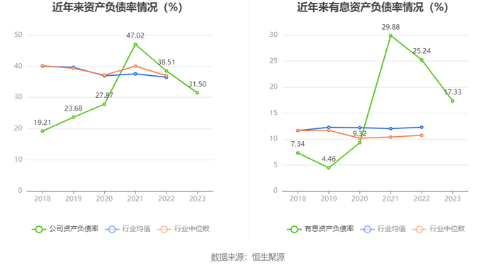在偿债能力方面,公司2023年年末资产负债率为31.50%,相比上年末下降7.01个百分点;有息资产负债率为17.33%,相比上年末下降7.91个百分点。