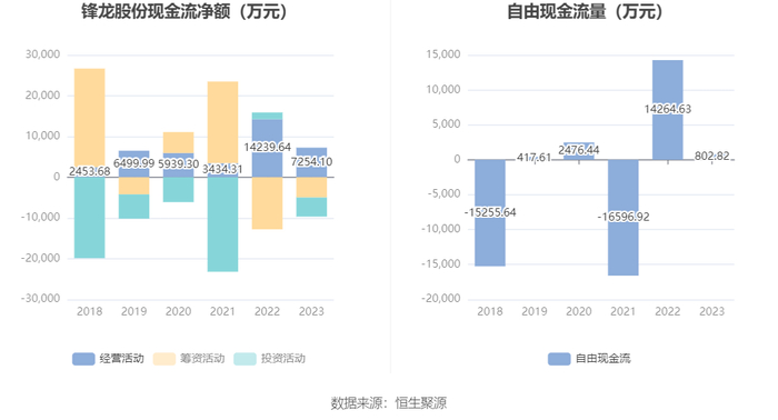 进一步统计发现,2023年公司自由现金流为802.82万元,相比上年同期下降94.37%。