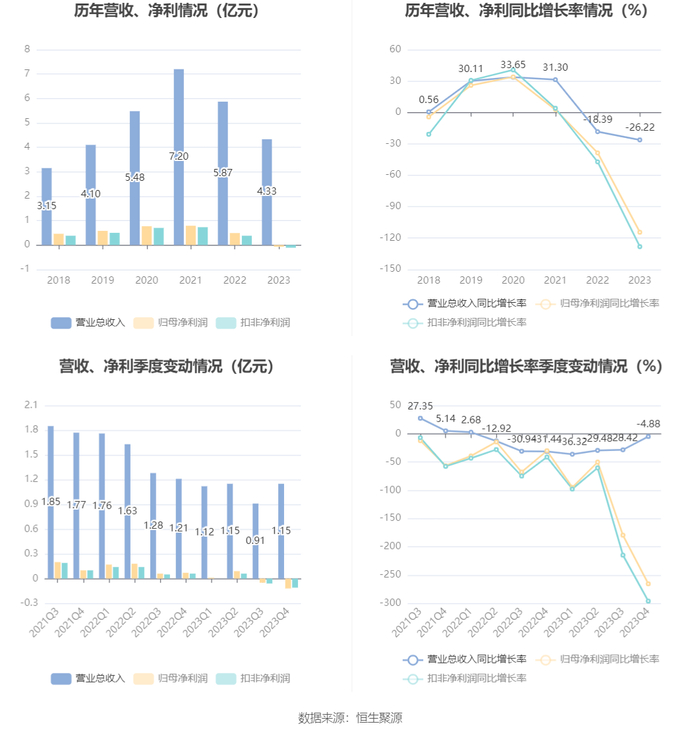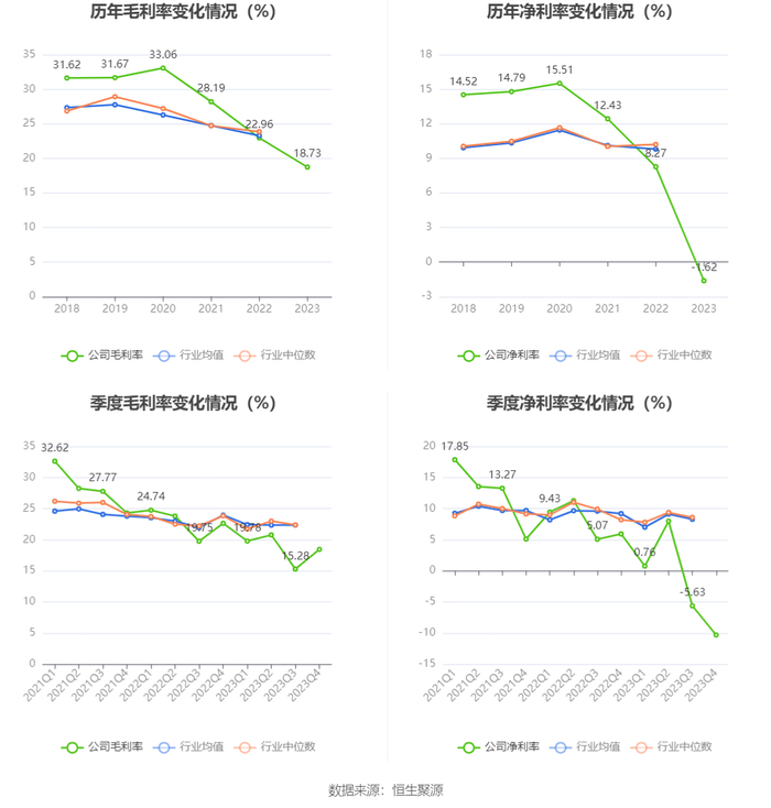 2023年,公司毛利率为18.73%,同比下降4.23个百分点;净利率为-1.62%,较上年同期下降9.89个百分点。从单季度指标来看,2023年第四季度公司毛利率为18.44%,同比下降4.19个百分点,环比上升3.16个百分点;净利率为-10.32%,较上年同期下降16.25个百分点,较上一季度下降4.69个百分点。