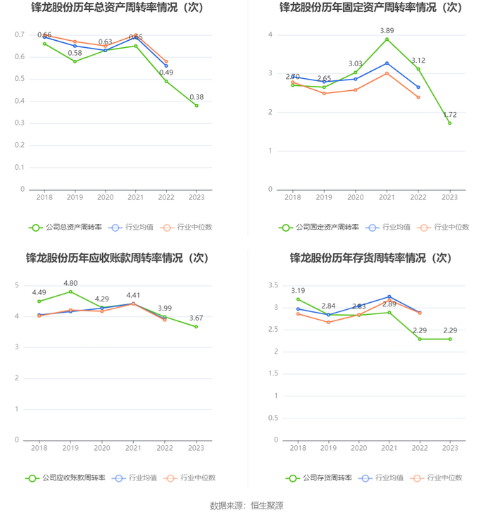 营运能力方面,2023年,公司公司总资产周转率为0.38次,上年同期为0.49次(2022年行业平均值为0.56次,公司位居同行业53/78);固定资产周转率为1.72次,上年同期为3.12次(2022年行业平均值为2.65次,公司位居同行业31/78);公司应收账款周转率、存货周转率分别为3.67次、2.29次。