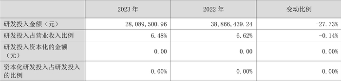 2023年全年,公司研发投入金额为2808.95万元,同比下降27.73%;研发投入占营业收入比例为6.48%,相比上年同期下降0.14个百分点。此外,公司全年研发投入资本化率为0。