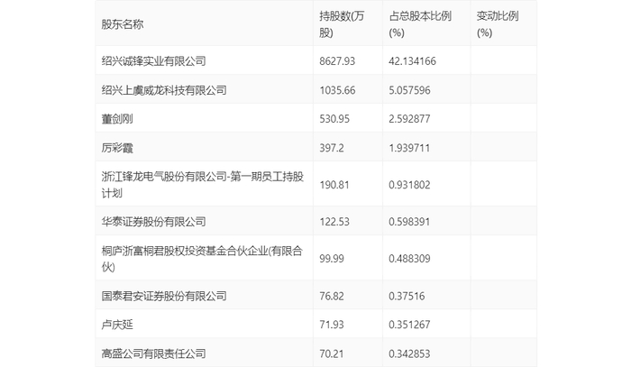 年报显示,2023年年末公司十大流通股东中,新进股东为华泰证券股份有限公司、国泰君安证券股份有限公司、卢庆延、高盛公司有限责任公司,取代了三季度末的易谋建、UBS AG、国金量化多因子股票型证券投资基金、李宇红。在具体持股比例上,绍兴诚锋实业有限公司、绍兴上虞威龙科技有限公司、董剑刚、厉彩霞、浙江锋龙电气股份有限公司-第一期员工持股计划、桐庐浙富桐君股权投资基金合伙企业(有限合伙)持股有所下降。