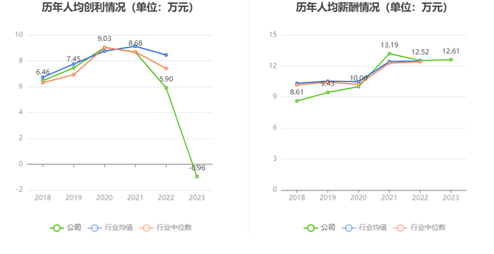截至2023年末,公司员工总数为737人,人均创收58.80万元,人均创利-0.96万元,人均薪酬12.61万元,较上年同期分别变化-17.61%、-116.18%、0.77%。