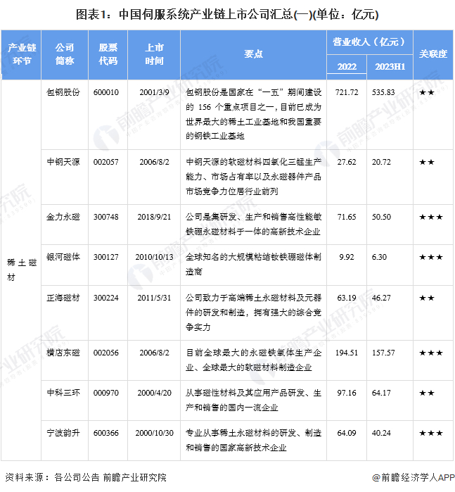 行业主要上市公司:包钢股份、中钢天源、金力永磁、银河磁体、正海磁材、横店东磁、中科三环、宁波韵升、汇川技术、禾川科技、雷赛智能、信捷电气、埃斯顿、伟创电气、鸣志电器、星辰科技、步科股份、正弦电气、科力尔、江苏雷利、昊志机电、微光股份、江特电机、蓝海华腾、华中数控、英威腾、新时达、众辰科技
