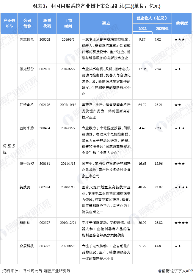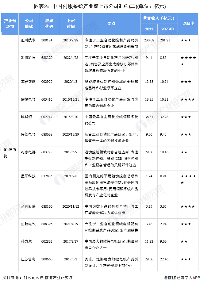 我国伺服系统行业产业链上市企业数量较多,其中,稀土磁材上市企业主要有包钢股份、中钢天源、金力永磁、银河磁体、正海磁材、横店东磁、中科三环、宁波韵升等;伺服系统上市企业主要有汇川技术、禾川科技、雷赛智能、信捷电气、埃斯顿、伟创电气、鸣志电器、星辰科技、步科股份、正弦电气、科力尔、江苏雷利、昊志机电、微光股份、江特电机、蓝海华腾、华中数控、英威腾、新时达、众辰科技等。