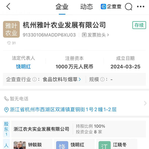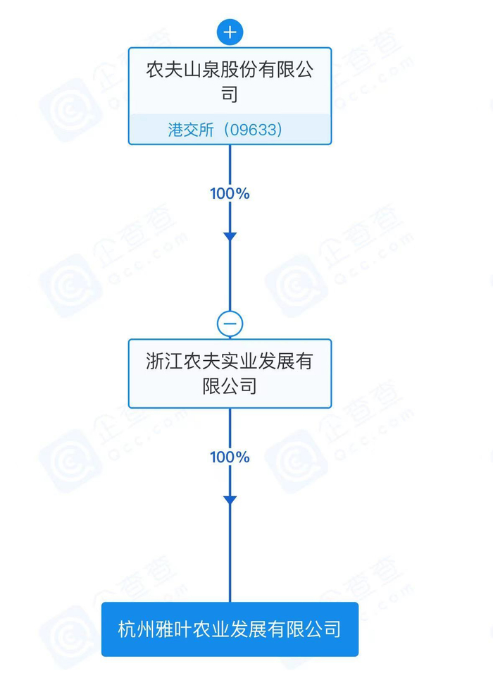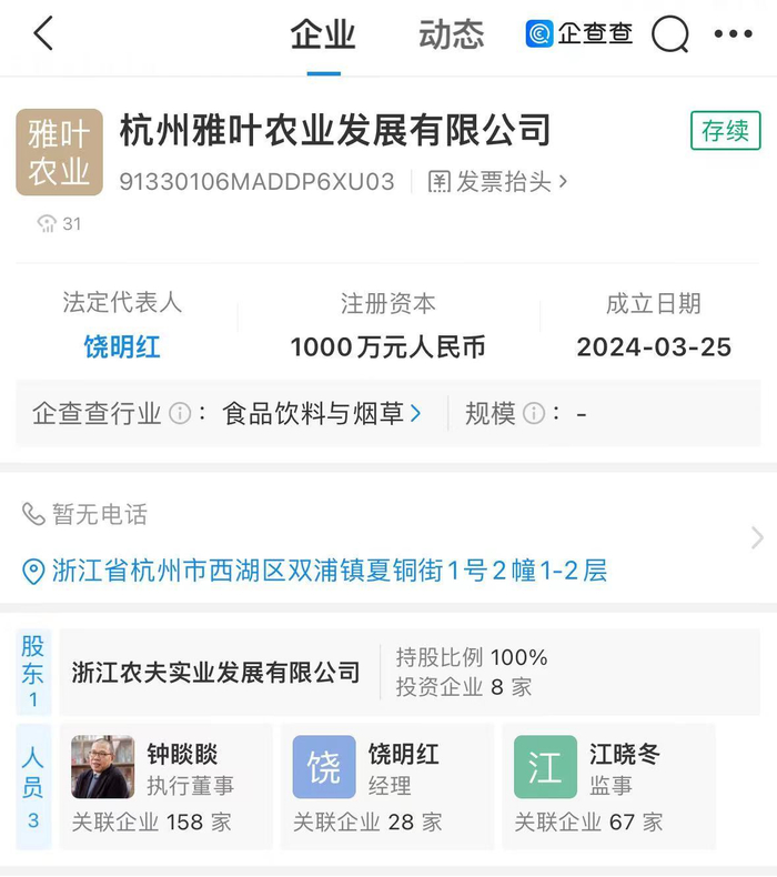 企查查App显示,3月25日,杭州雅叶农业发展有限公司成立,法定代表人、经理为饶明红,执行董事为钟睒睒,注册资本1000万人民币,经营范围包括茶叶制品生产、初级农产品收购、发酵过程优化技术研发等。股权全景穿透信息显示,该公司由浙江农夫实业发展有限公司全资持股,后者为农夫山泉(HK.09633)全资子公司。