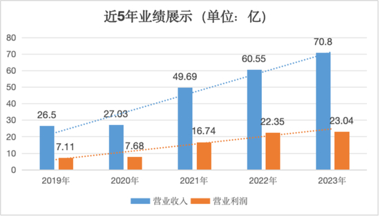 根据五年期财报数据显示,营收层面,舍得酒业自2019年26.5亿增长至2023年约70.8亿,业绩规模翻了不止一番,年均增长率高达52.83%;营业利润层面,舍得酒业自2019年7.11亿增长至2023年约23.04亿元,业绩规模翻了将近两番,年均增长率高达64.81%。