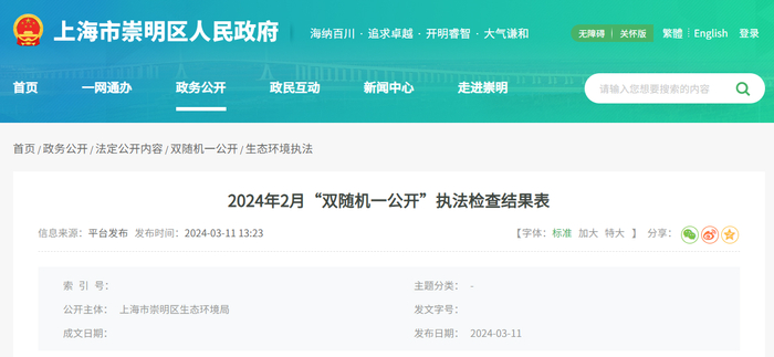 上海市崇明区生态环境局2024年2月“双随机一公开”执法检查结果
