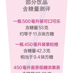 反而是一些“低糖”“无糖”饮料,大多明确标出了含糖量。如统一绿茶的“低糖”版饮料的营养成分表中标明,每100毫升饮料含糖4克。喜茶推出的低糖浓果茶、元气森林推出的低糖丝绒草莓乳茶,每100毫升的含糖量均在5克以下。不过,按照相同容量来计算时有些“低糖”产品也不符合标准,以一瓶450毫升的喜茶低糖浓果茶为例,每100毫升含糖量为4.9克,那整瓶的含糖量达到22.05克。按照膳食指南中“居民每天添加糖最好控制在25克以下”的建议,喝下一瓶低糖饮料,当天的“甜蜜度”也几近饱和。