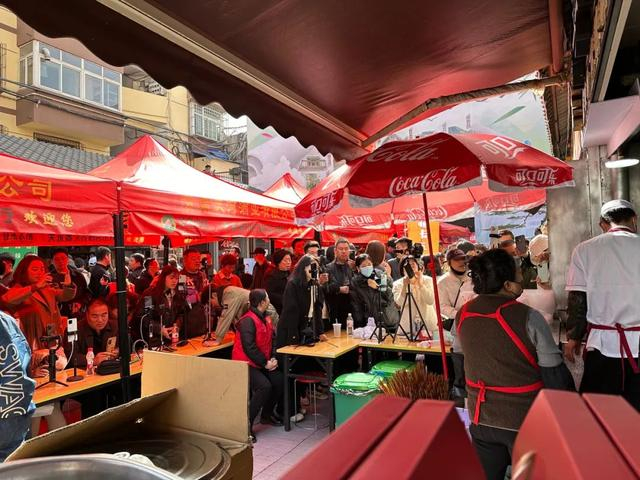 其中,一家网红麻辣烫店门口变成了直播间,三面围着桌子,挤满了正在直播的博主们。