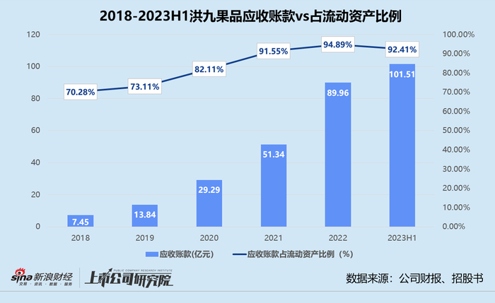 值得一提的是,洪九果品应收账款占流动资产的比例一直畸高,且呈上升趋势。2018-2022年,该指标分别为70.28%、73.11%、82.11%、91.55%、94.89%。2023年上半年,公司超百亿规模的应收账款占比流动资产约92.41%,占比总资产约89.93%,而处于同赛道的百果园对应分别录得20.68%、8.60%。
