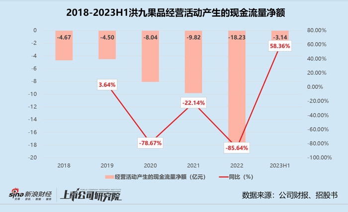 细究这份“带崩”股价的半年报,2023年1-6月洪九果品实现总营收85.41亿元,同比增长19.28%。净利润约为8.03亿元,而2022年同期为8.59亿元。经营活动产生的现金净流出录得3.14亿元,虽然同比有所收窄,但依旧难改“流血不止”的局面。