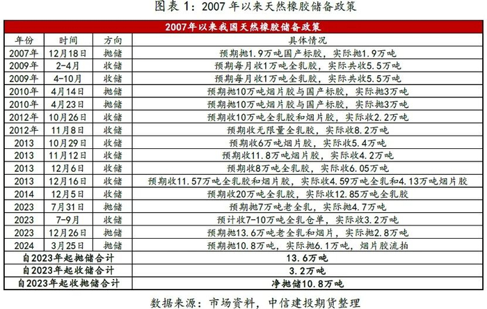 自2023年起,暌违接近10年之久的天然橡胶储备政策再次启动。从历史经验来看,一轮完整的储备政策约经历3-4年,一般来说采用“先抛后收”的方式完成一轮天然橡胶储备的更迭。本轮储备政策启动于2023年7月,截至2024年3月25日,本轮储备政策共抛储3次,收储1次,净抛储10.8万吨(其中大部分为全乳胶)。由于在上一轮2010年至2014年的储备政策期间,共净收储41.62万吨,收储量相对较多,结合目前的政策节奏来看,本轮储备政策或仍处于抛储阶段。