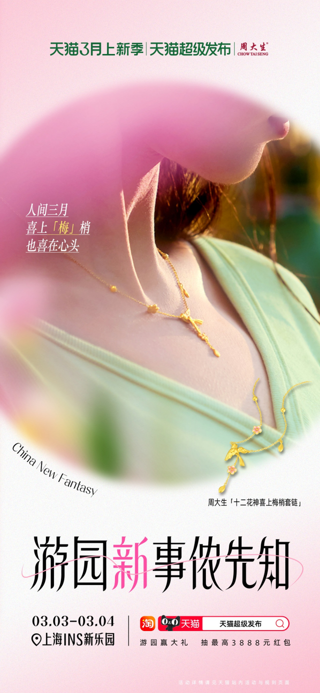 基于三八国际劳动妇女节,天猫以“了不起的国牌”为话题,开展一场天猫超级发布活动。周大生作为唯一受邀的珠宝品牌,发布了十二花神系列新品——喜上梅梢。