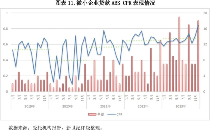 目前经济仍处于弱复苏态势,政策持续推动社会综合融资成本下行,普惠小微企业宽松融资环境得到延续。2023年,全国新发放普惠型小微企业贷款平均利率为4.78%,自2018年一季度持续下行以来已累计下降3.03个百分点。在此环境下,小微借款人仍具备置换更低成本贷款的需求。2023年微小企业贷款ABS基础资产条件平均提前还款率(CPR)[5]处于65%以上,仍维持较高水平。当前宏观利率仍存在下行空间,预计小微企业仍将存在提前还款需求。