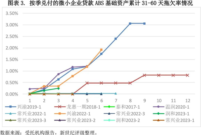 在选取的13单按季兑付的静态现金流微小企业贷款ABS中,从最后一个表现期的累计31-60天拖欠率来看,大多数按季兑付产品的累计31-60天拖欠率低于1.50%,最高累计31-60天拖欠率为3.07%。“常兴业”系列产品累计31-60天拖欠率表现最优。