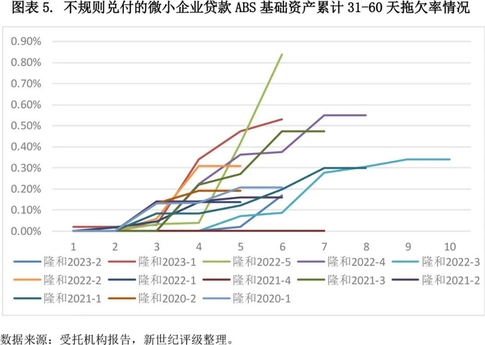 在选取的13单不规则兑付的微小企业贷款ABS(静态现金流)中,从最后一个表现期的累计31-60天拖欠率来看,大多数不规则兑付产品的累计31-60天拖欠率均低于0.60%,最高累计31-60天拖欠率为0.84%,“隆和”系列产品基础资产整体表现较优。