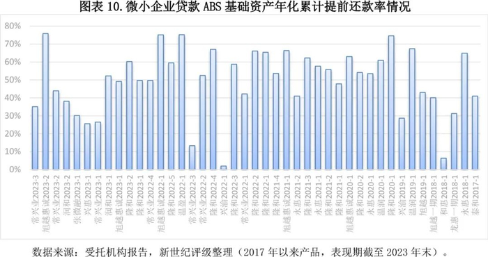 另外,微小企业贷款ABS产品普遍存在基础资产提前还款率较高的情况。随着金融机构对小微企业续贷持积极态度以及政策持续推动综合融资成本下行,普惠小微企业宽松融资环境仍将继续保持,小微借款人具备置换更低成本贷款的需求,小微贷款类ABS基础资产提前还款率预计将维持高位且产品提前兑付的情况仍将持续。